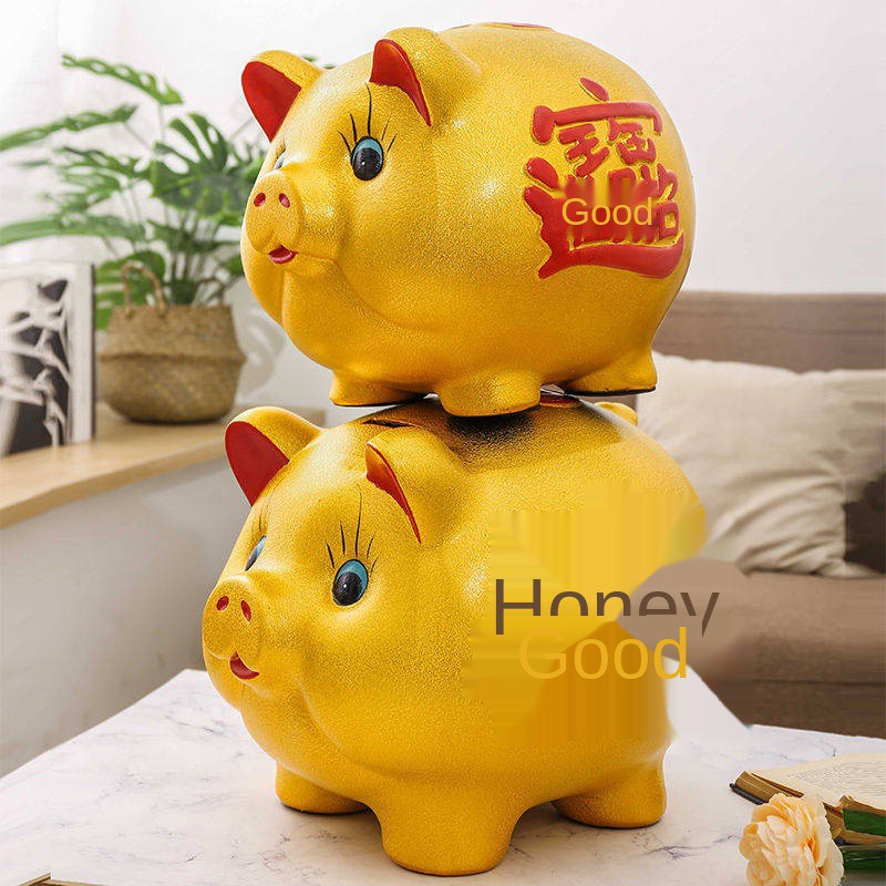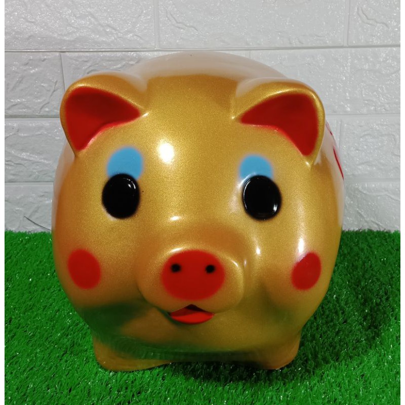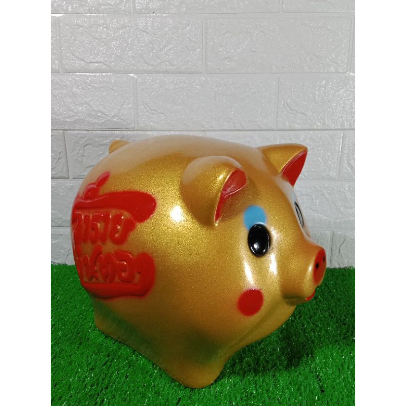 😊 กระปุกออมสินรูปหมู สีทอง พิมพ์อักษรภาษาจีน 🐷 ขนาด กว้างxยาวxสูง 8x10x7 ซ.ม.